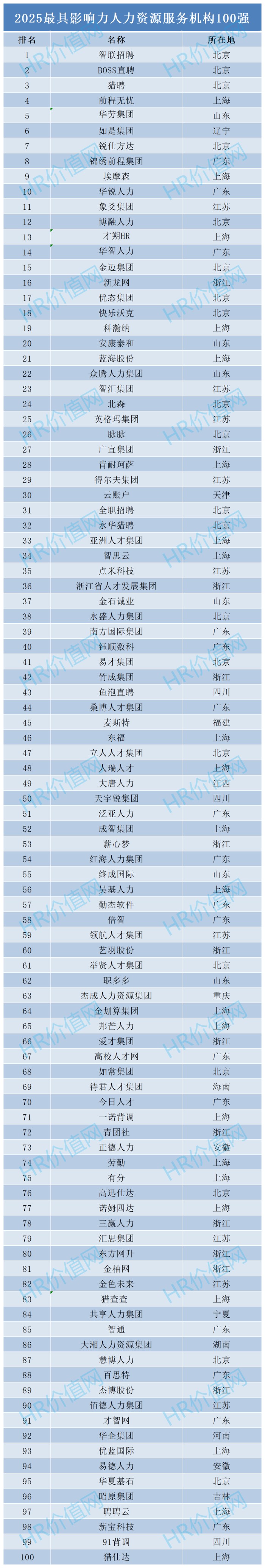 近日,“2025最具影响力人力资源服务机构100强”榜单揭晓,智联招聘、BOSS直聘、猎聘位列榜单前三位。榜单主要从人力资源服务机构服务能力、品牌影响力、社会责任等多维度进行评价编制,旨在帮助企业从众多的人力资源服务机构中甄选适合且优质的人力资源服务商,帮助人力资源服务机构从众多企业中脱颖而出,提高市场占有率和品牌影响力。