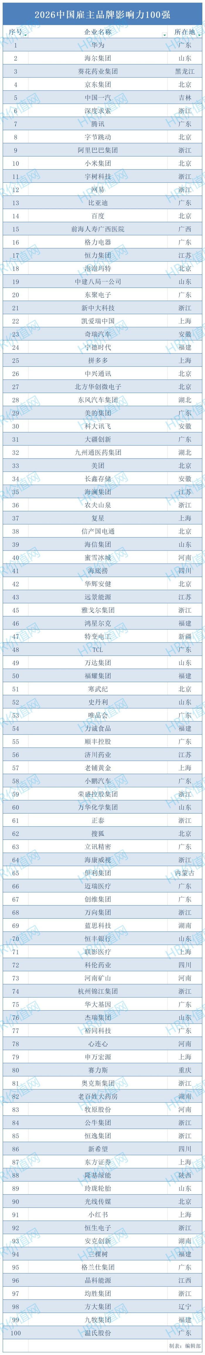 当人才竞争进入高质量发展新阶段,雇主品牌已成为企业吸引全球精英、构筑核心竞争力的战略基石。今日,备受业界瞩目的“2026中国雇主品牌影响力100强榜单”正式揭晓!本次榜单由深耕人力资源领域的权威平台HR价值网倾力打造,历经数月的企业申报、多维评估、数据核验与评审,最终从数百家企业中筛选出综合实力卓越的100家标杆雇主,为中国企业雇主品牌建设树立新标杆,为广大求职者绘制清晰的就业导航云图。